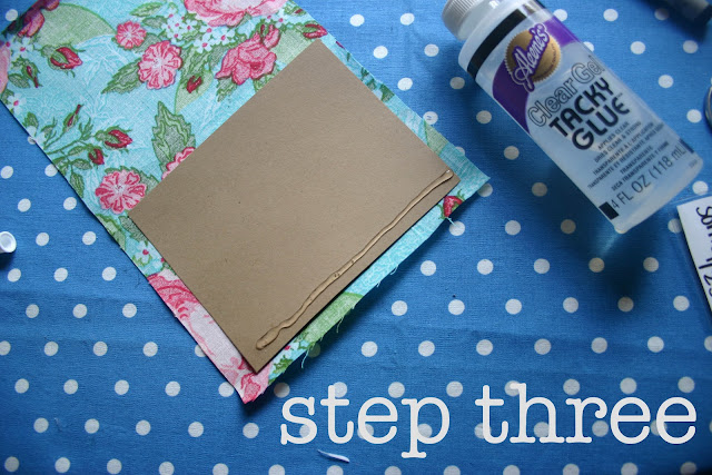 3. place cardstock on the top half of the fabric (wrong side), run a line of glue along the edge then fold fabric over.
